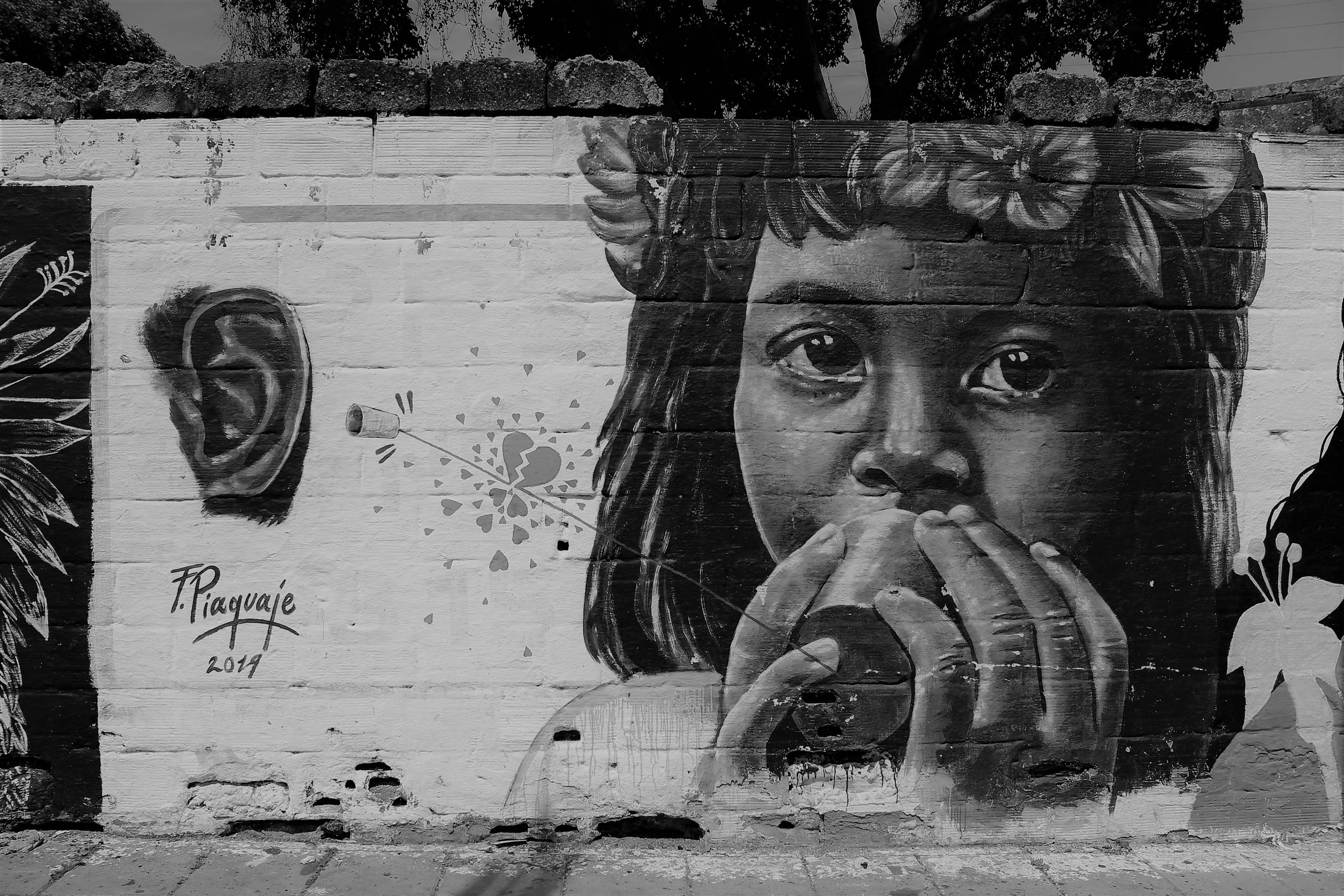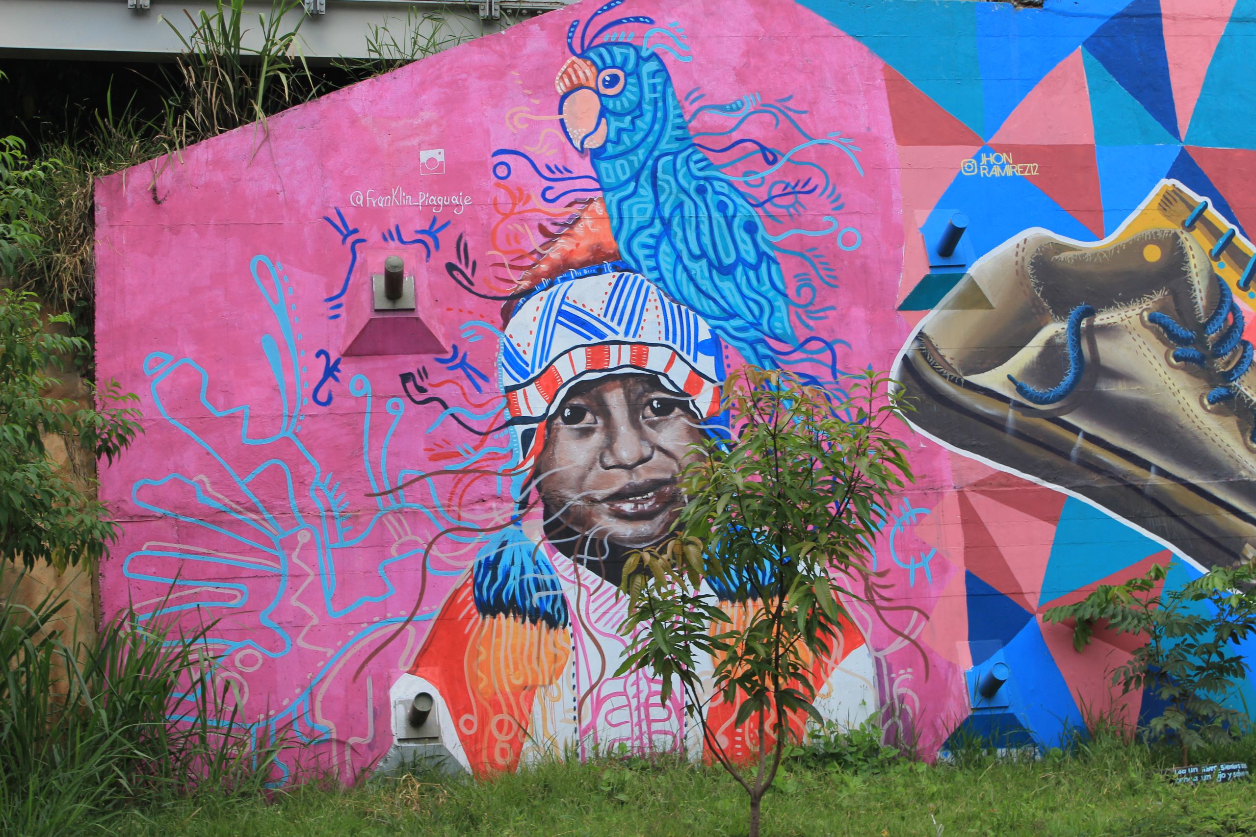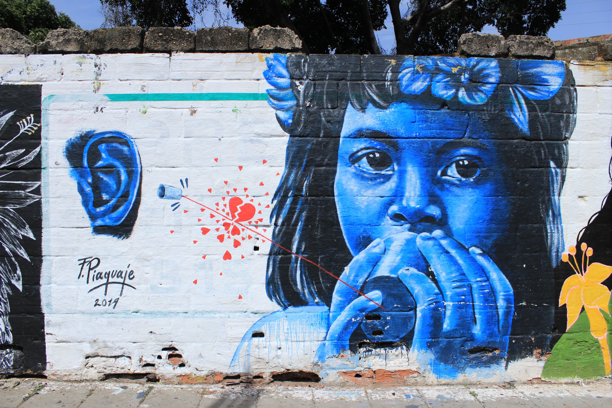 Algunos lo escuchan como: ‘¡fus!, !fus!’; ¡chss!, ¡chss!; ó ¡shss! ¡shss!; lo cierto es que no existe la onomatopeya precisa para describir el sonido del aerosol al salir la pintura, ni emoción explicable al momento de pintar un mural en la calle, cuenta David Guerrero, joven del colectivo ‘Muros con sentido’, mientras interviene un muro del barrio San Miguel de Bucaramanga en donde antes se encontraba publicidad política ilegal. El resultado es la figura de un tigre, entre colores morados, amarillos y rojos. Antes de de recoger todos sus materiales Franklin, otro artista del colectivo, pone su firma: ‘Piaguaje’, su apellido de origen Siona, pueblo indígena asentado en el Putumayo y desplazado por la violencia.