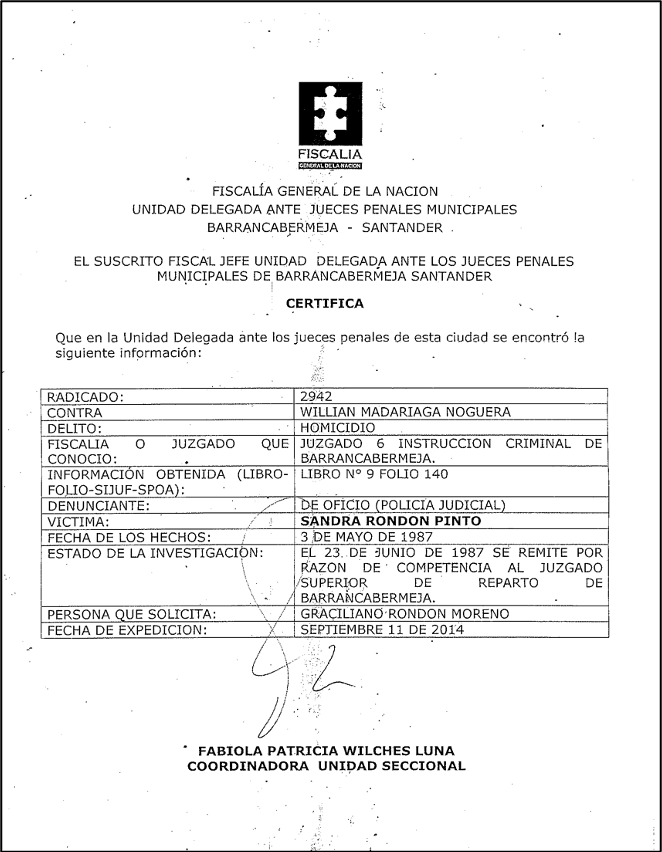 Documento certificación de la Unidad delegada ante jueces penales municipales Barrancabermeja – Santander, informa a Graciliano Rondón que la Fiscalía o Juzgado que conoció del caso fue el JUZGADO 6 Instrucción Criminal de Barrancabermeja Libro No. 9 Folio 140. Dice que el 23 de junio de 1987 se remitió por razón de competencia al Juzgado Superior de Reparto de Barrancabermeja. (Fiscalía General de la Nación - Unidad Delegada ante jueces penales municipales, 2014)