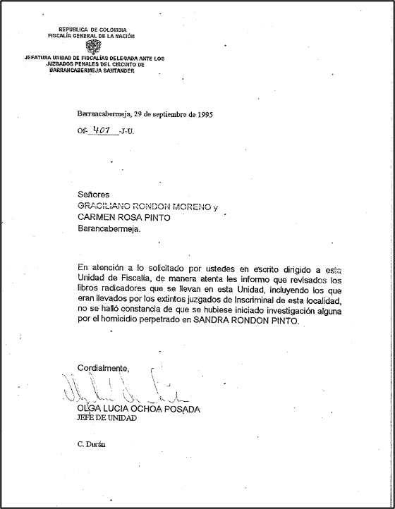 Carta del 29 de setiembre de 1995 de la Fiscalía, dirigida a Graciliano Rondón y Carmen Rosa Pinto, en el que se informa que “…revisados los libros radicadores que se llevan en esta Unidad, incluyendo los que eran llevados por los extintos juzgados de Inscriminal de esta localidad, no se halló constancia de que se hubiese iniciado investigación alguna por el homicidio perpetrado en SANDRA RONDÓN PINTO”
