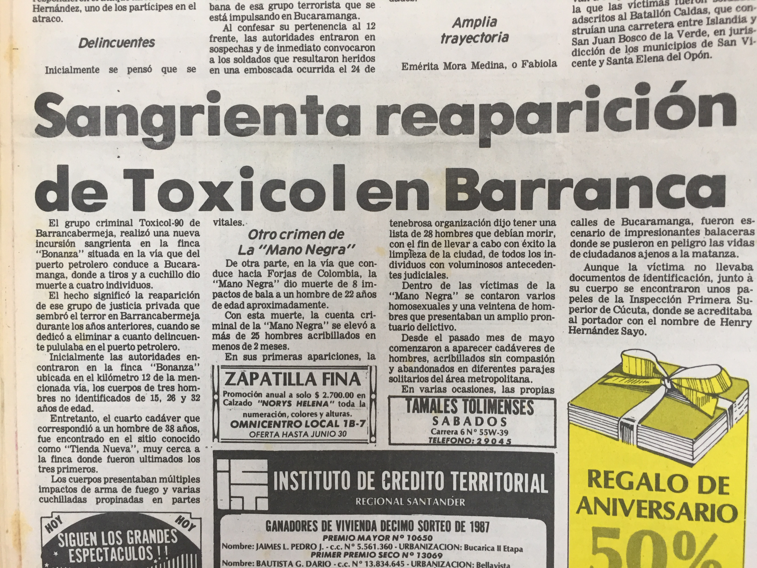 Toxicol-90 fue un de los primeros grupo de paramilitares con operación de Barrancabermeja (Vanguardia Liberal - 27 de junio de 1987)