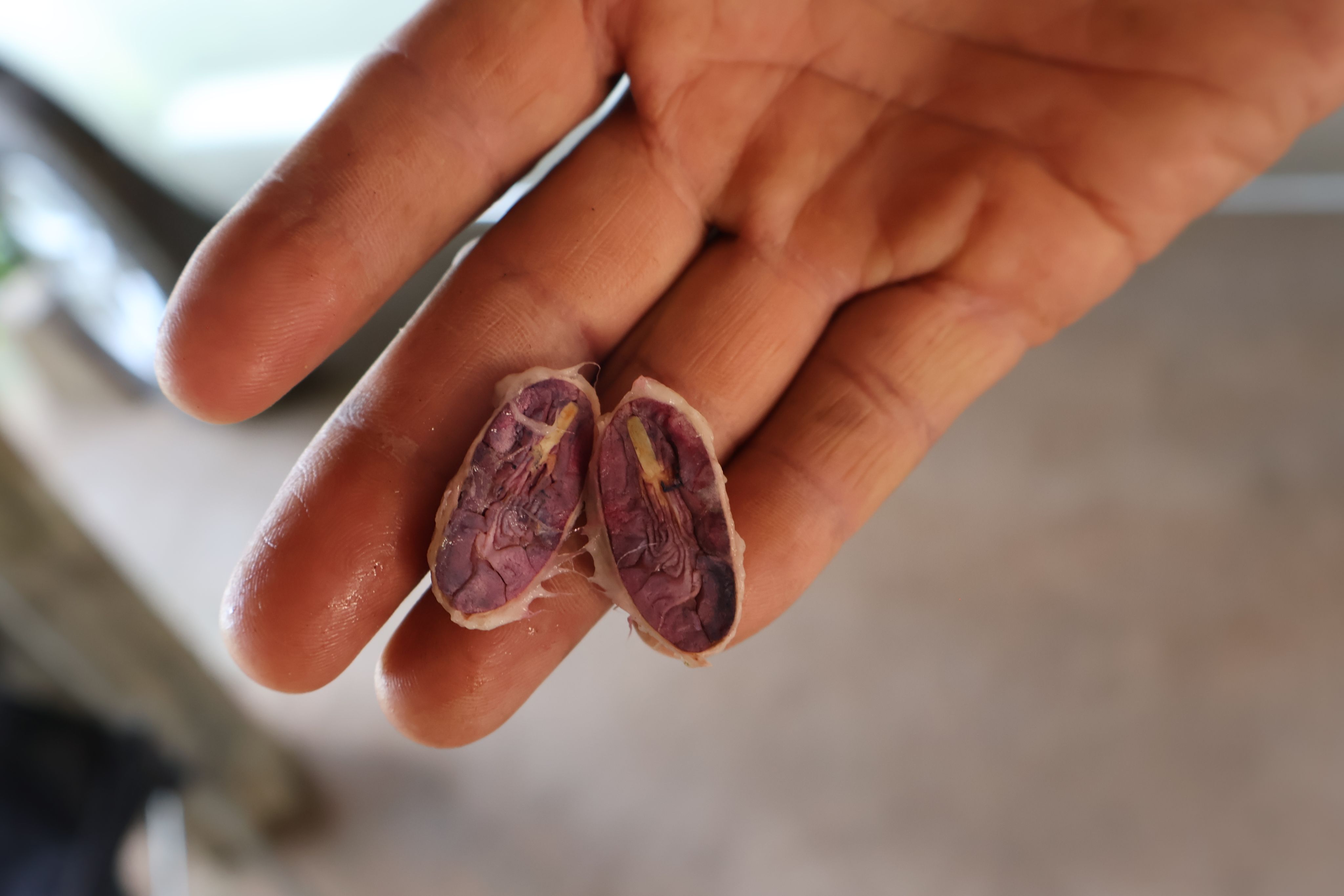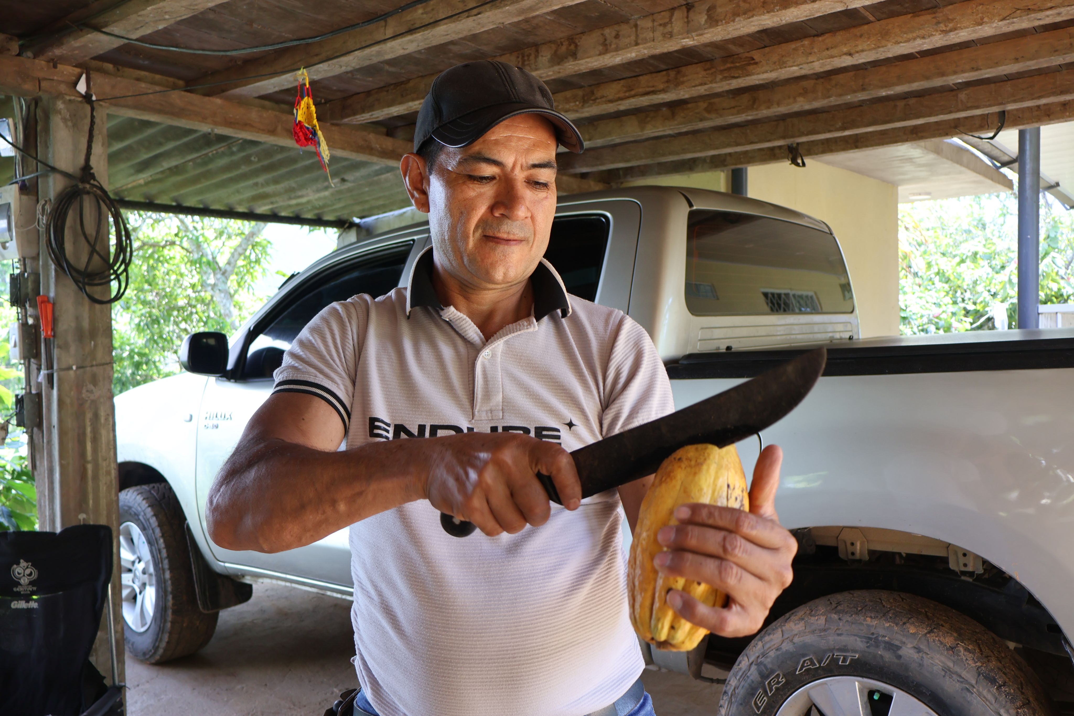Edier explica el proceso de transformación de la mazorca de cacao, el cual va desde la cosecha hasta la obtención del grano, utilizando un lenguaje preciso y lleno de términos propios: "engrullar es partirla y sacarle la pepa que tiene por dentro" Esta descripción detallada permite visualizar una etapa del proceso del cacao.
