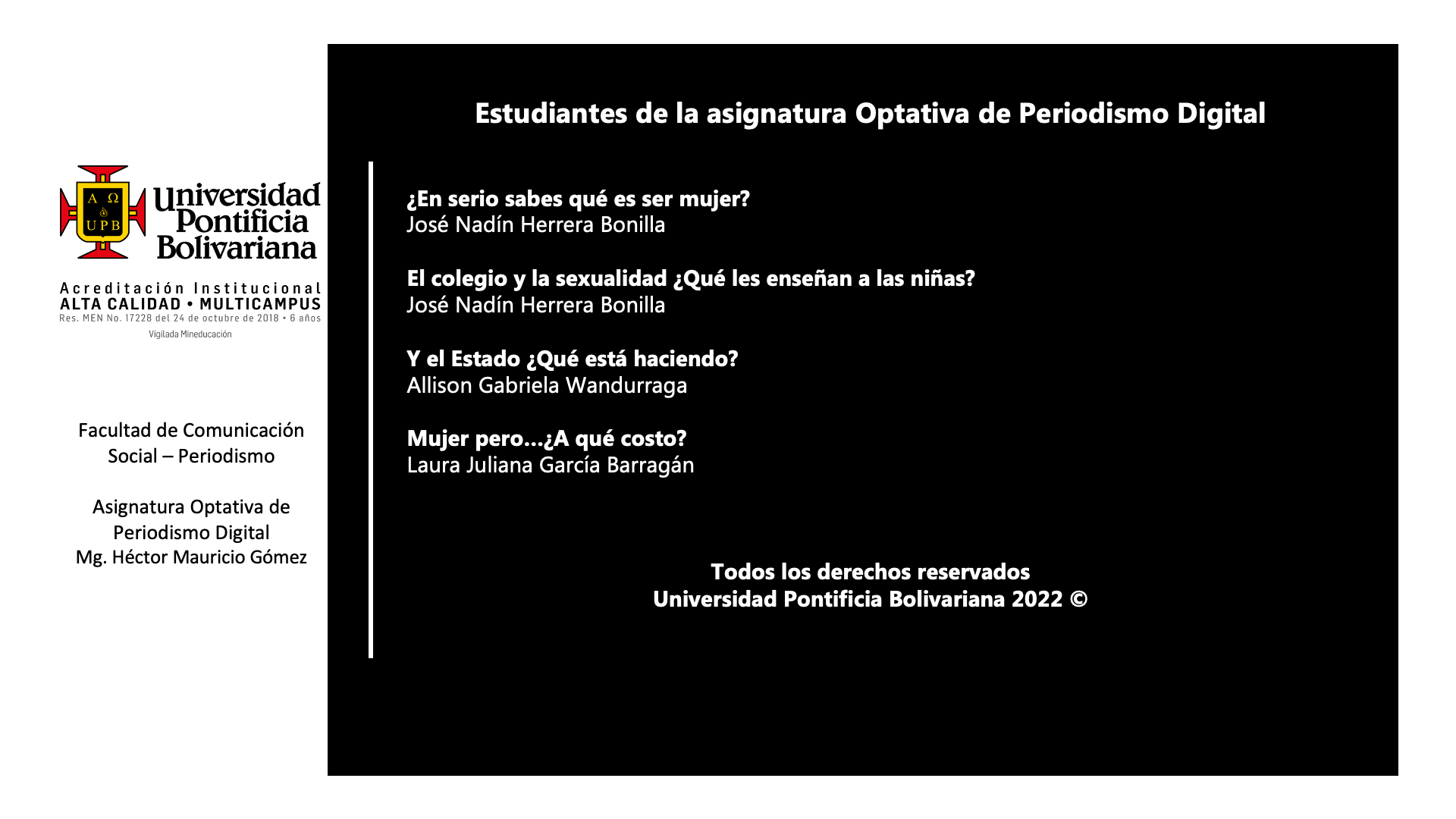 Un reportaje de la asignatura de Narrativa y Taller de Televisión I de la UPB. El tema de la Educación Sexual en muchas ocasiones no es tenido como prioritario en diferentes espacios. Un primer momento es la menstruación, como primera unidad es clave para el desarrollo de la mujer adolescente y su entorno; el desconocimiento y la no atención temprana genera en el futuro desigualdades y una cadena de desinformación. La dignidad menstrual es un derecho.