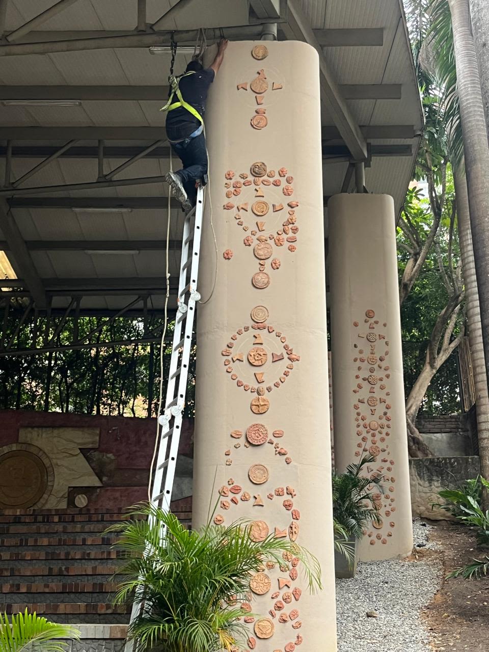 Detalle de una de las columnas intervenidas con las piezas resultado del proceso investigativo con mejoramiento del jardín.